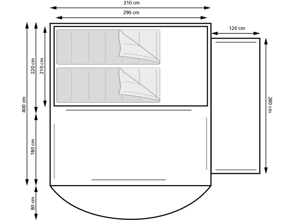 Součástí předstanu je vnitřní stan o rozměrech 140 x 290 cm, který je ideální pro dvě osoby. Tento stan může sloužit jako ložnice, ale také jako skladovací prostor pro vaše vybavení. Pokud máte větší potřebu prostoru, vnitřní stan lze snadno přizpůsobit podle vašich potřeb. Kapsy ve vnitřním prostoru vám pomohou uspořádat všechny drobnosti, které si chcete uchovat po ruce.