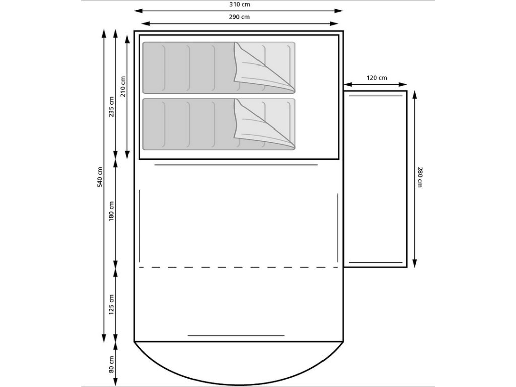 Součástí předstanu je vnitřní stan o rozměrech 290 x 210 cm, který je ideální pro čtyři osoby. Tento stan může sloužit jako ložnice, ale také jako skladovací prostor pro vaše vybavení. Pokud máte větší potřebu prostoru, vnitřní stan lze snadno přizpůsobit podle vašich potřeb. Kapsy ve vnitřním prostoru vám pomohou uspořádat všechny drobnosti, které si chcete uchovat po ruce.