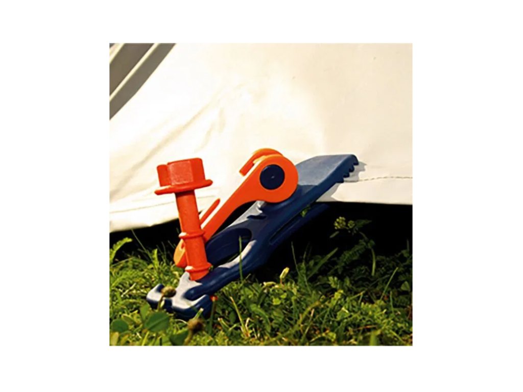 Krokodýl – rychloupínací svorka – tato svorka je velmi universální a praktická pro uchycení jakékoli kempingové „tkaniny“ – tedy pro stany, přístřešky, kempingové koberce apod.