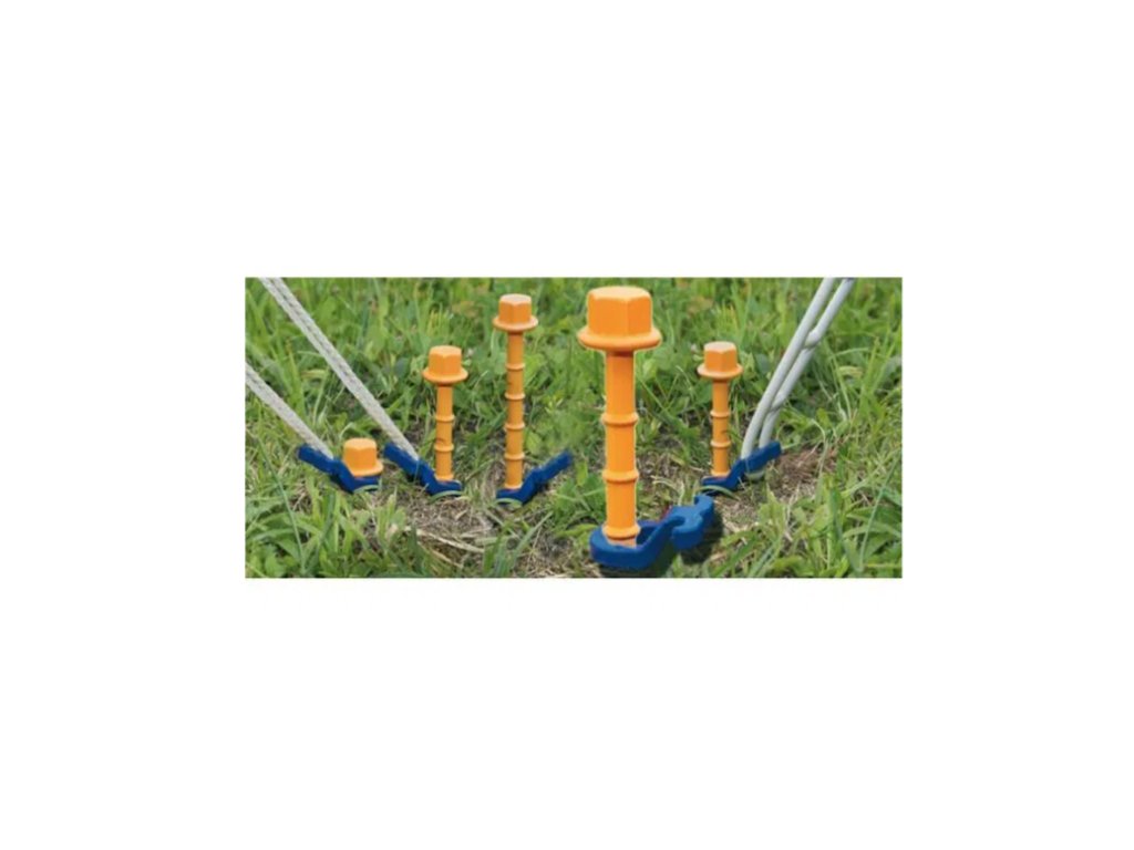 PP02 – Kolíky 20cm – kolíky jsou vyrobeny z velmi odolného plastu. Vzhledem ke skutečnosti, že se kolíky do země ŠROUBUJÍ, tak se nestane, že budou např. poryvem větru vytrženy. Kolíky se šroubují pomocí nástrčkového klíče, aku-vrtačky nebo položky PP06 šroubováku Peggy Peg (viz související zboží). Pro demontáž těchto kolíků je stačí vyšroubovat. Tyto šroubovací kolíky jsou pět krát lehčí než podobný kovový ekvivalent kolíku a mají deset krát silnější záběr v půdě. Tento typ kolíků je vhodný do měkčího (travnatého) nebo písčitého podkladu. Součástí sady jsou i háčky (ke každému kolíku jeden), které lze navléct na kolík a pomocí nich upnout na kolík popruh. Sada obsahuje 12 kusů. Tento výrobek vyhrál kategorii Innovations fro new mobility na Caravaning Design Award 2010/2011.