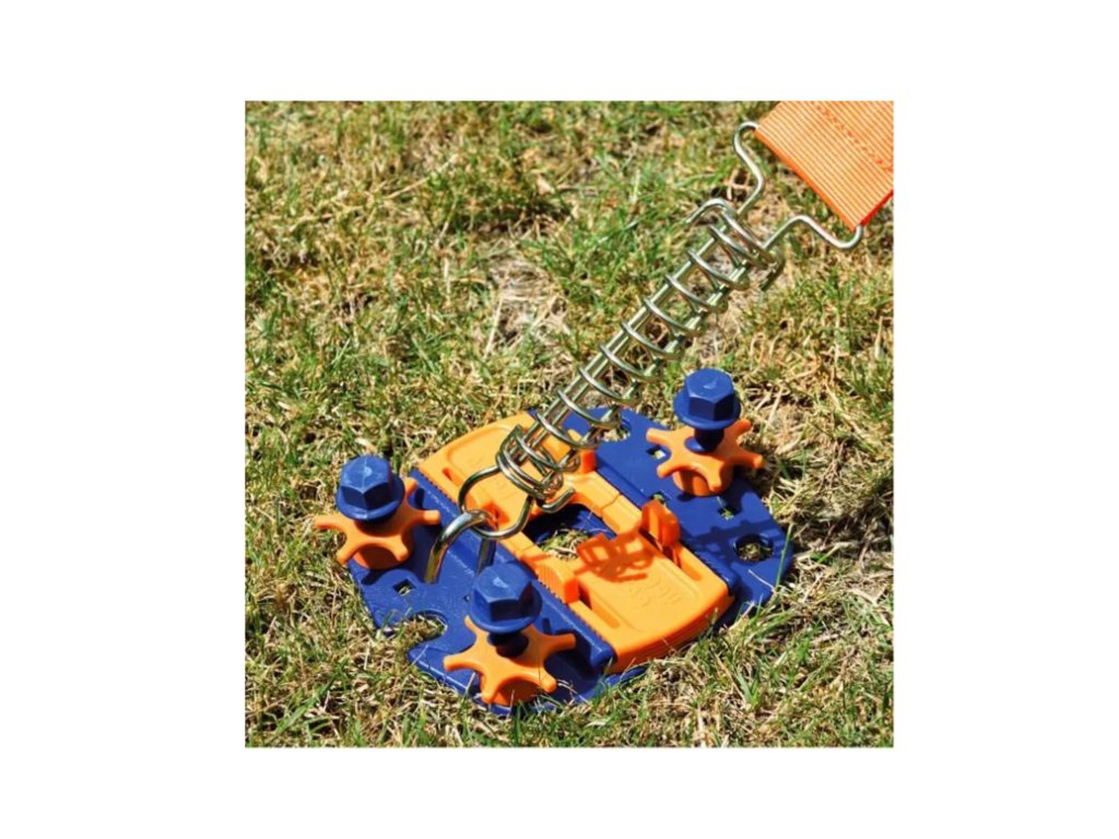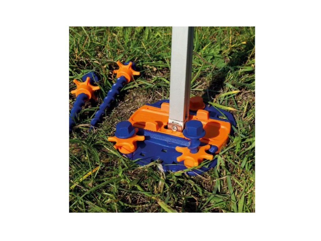 Upevňovací podložka pro přístřešky, nohy markýzy – touto podložkou lze uchytit jakoukoli tyč od přístřešku nebo nohy rozvinuté markýzy – tedy jakoukoli tyč, která se kotví do země.
