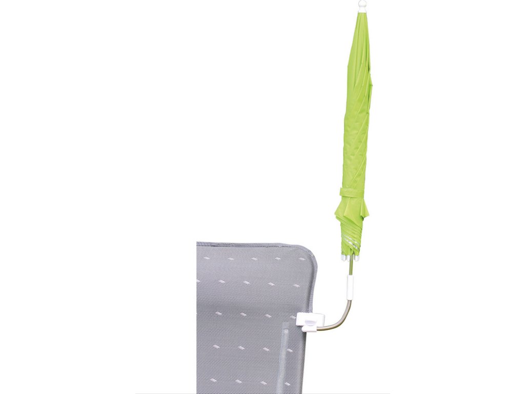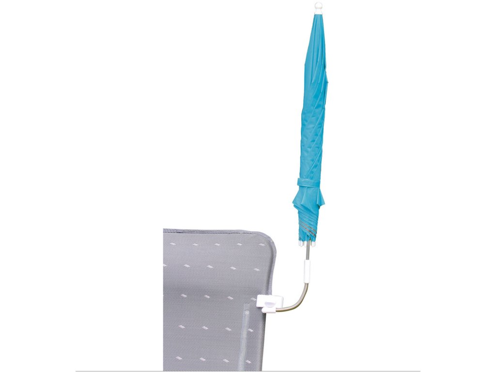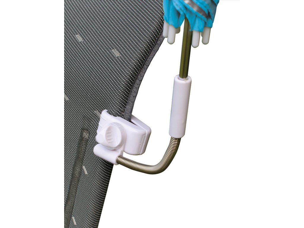 Slunečník se upevňuje pomocí malého svěráku, který je součástí balení. Tento svěrák umožňuje pevné uchycení slunečníku na konstrukci křesla nebo lehátka, přičemž ocelová tyč o průměru 8 mm a maximálním průměru uchycení až 2,8 cm zaručují stabilitu a bezpečnost. Ohebná část slunečníku vám umožní snadno nastavit jeho úhel a směr, čímž si zajistíte ideální zastínění bez ohledu na polohu slunce.