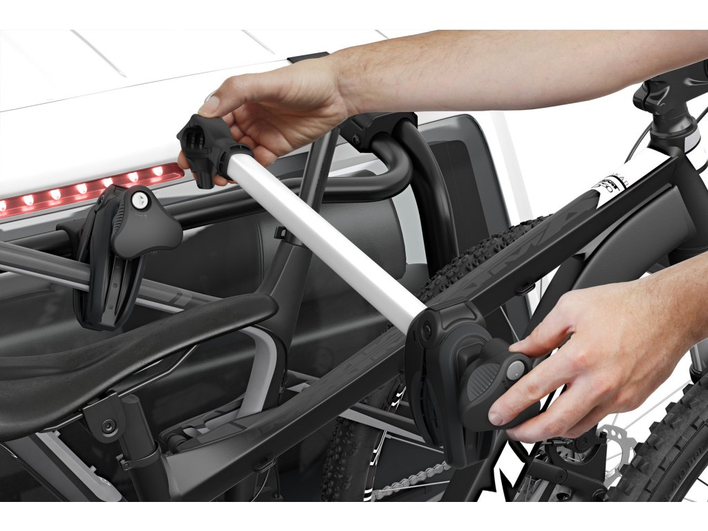 Snadná montáž jízdních kol pomocí odnímatelných ramen s uzamykací růžicí s kroutícím momentem Thule AcuTight. Po dosažení optimálního momentu -klikne.