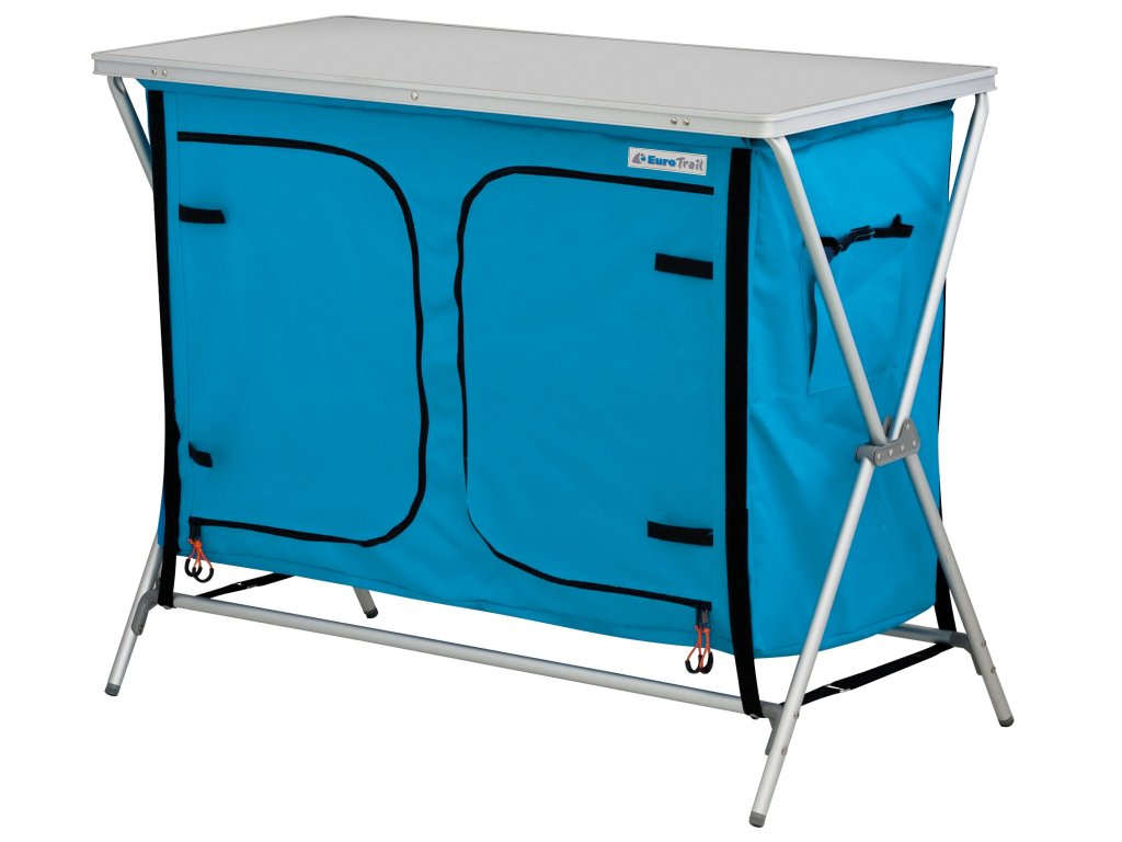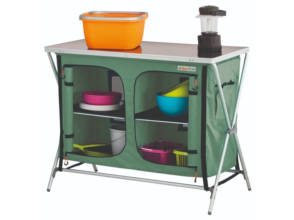 Díky své ideální pracovní výšce je skříňka Bonaire perfektní pro použití jako pracovní plocha pro přípravu jídel, stolek pro odložení nádobí nebo jako příruční skříňka na ukládání vašich kempingových potřeb. Její kompaktní rozměry (102 × 50 × 82 cm) poskytují dostatek prostoru pro všechny základní potřeby, ale nezabírá přitom příliš místa ve vašem stanu nebo karavanu.