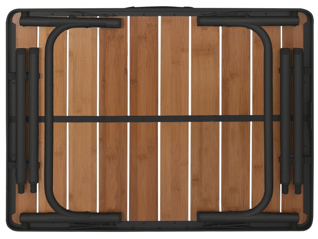 Vrchní deska stolu je vyrobena z kvalitního voděodolného bambusového materiálu, který je odolný vůči vlhku a dešti. Bambus je nejen velmi odolný, ale i ekologický materiál, který dodává stolu moderní a přírodní vzhled. Tato deska je ideální pro venkovní použití, protože odolává povětrnostním vlivům a je snadná na údržbu. Díky své voděodolnosti je stůl perfektní volbou pro kempování v různých podmínkách – i v deštivých dnech se nemusíte obávat poškození povrchu.