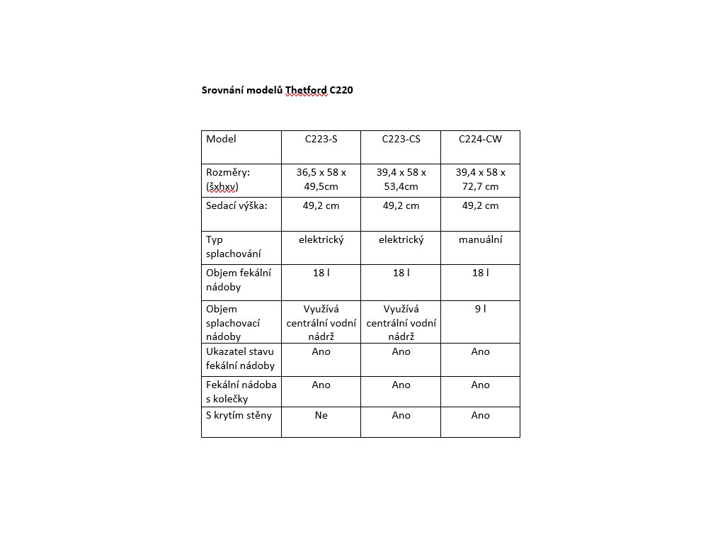 Modely série Thetford C220, mezi které patří i kazetová toaleta C223-S, jsou navrženy s důrazem na maximální komfort, prostorovou úspornost a snadné použití. Tento vestavný systém WC patří mezi nejoblíbenější řešení pro obytné vozy, karavany či dodávky přestavěné na kempovací účely, protože nabízí otočnou toaletní mísu, odnímatelnou kazetovou nádrž a moderní design s praktickými funkcemi, které vám usnadní život na cestách.